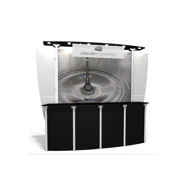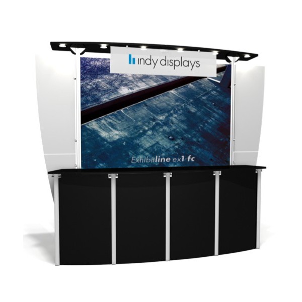 The structure of this trade show booth is made from custom modular aluminum extrusions. The structure of the Exhibit Line system gives your company a trendy modern look. The ex1.fc display kit includes a custom flat laminate canopy that holds 6 halogen lights. The ex1 display kit also includes a full front counter for displaying products and brochures. The entire trade show booth can be packaged in one 48.25T shipping case (47"x23.5"7"). Total weight of the exhibit booth is 95 lbs.