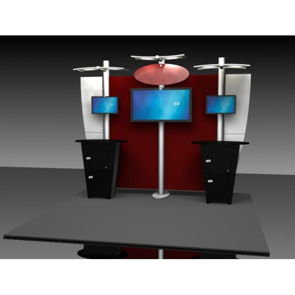 XRline Custom XR.09 10ft Monitor Display is an interactive 10ft trade show exhibit that features three monitor mounts, tension fabric graphics, and custom canopies with halogen lighting. Xrline trade show displays look very high-end and can meet almost any exhibit need you may have such as displaying new products, mounting flat screens, locking counter storage. The XR.09 fits into two rotomolded trade show display cases.