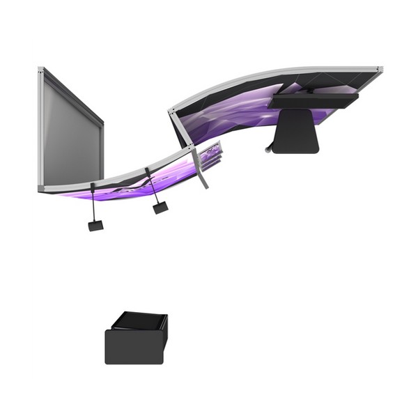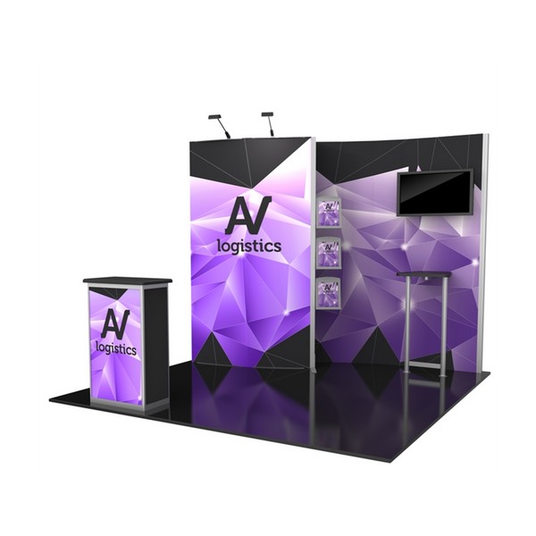 10' x 10' Hybrid Modular Display Kits are designed to leave a lasting impression. With their sophisticated, feature-rich backwall layouts, these custom modular hybrid displays are going to help you outshine the competition at your next trade show. Our 10ft Hybrid Modular Displays are an ideal solution for the experienced trade show exhibitor. Each modular display kit includes heavy duty aluminum modular hardware along with seamless dye sublimation graphics, that product vibrant wrinkle-free colors and images. Hybrid Kit B features one monitor mount, one attachable straight leg counter, and front matching podium counter that creates an inviting 10' x 10' multimedia booth space. In addition, the convex right portion of the backwall creates space behind the trade show display for storage and display cases.