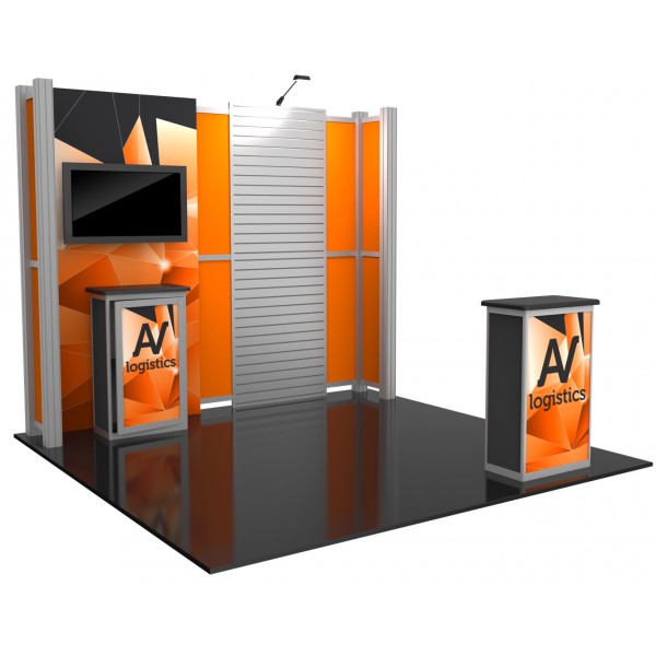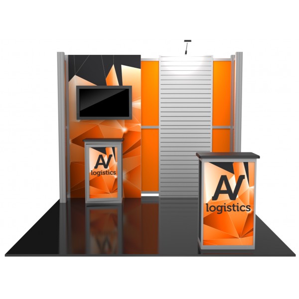 10' x 10' Hybrid Modular Display Kits are designed to leave a lasting impression. With their sophisticated, feature-rich backwall layouts, these custom modular hybrid displays are going to help you outshine the competition at your next trade show. Our 10ft Hybrid Modular Displays are an ideal solution for the experienced trade show exhibitor. Each modular display kit includes heavy duty aluminum modular hardware along with seamless dye sublimation graphics, that product vibrant wrinkle-free colors and images. Hybrid Kit H features one monitor mount, one counter near the backwall, and one slatwall panel that creates an inviting 10' x 10' multimedia booth space for product displaying. An LED floodlight, attached to the backwall, illuminates the space. There are also many additional features available such as an extra counter (pictured in foreground), literature racks, stand-alone kiosks, and more.