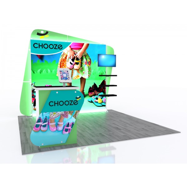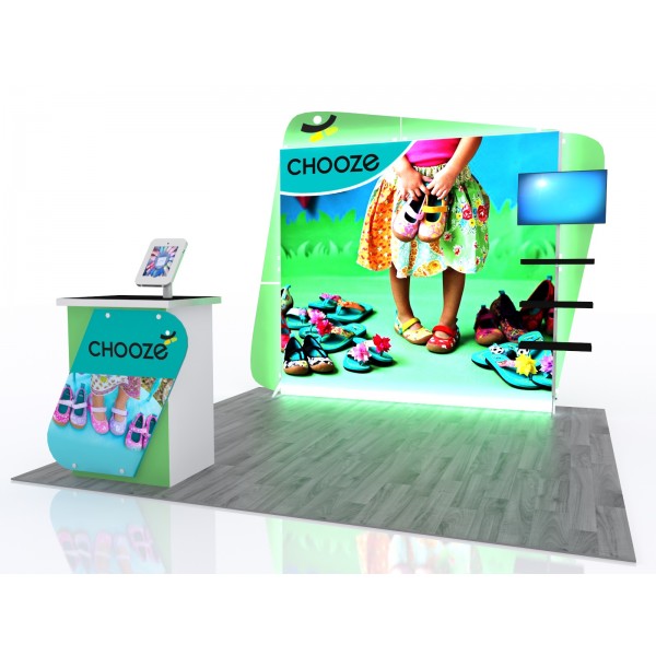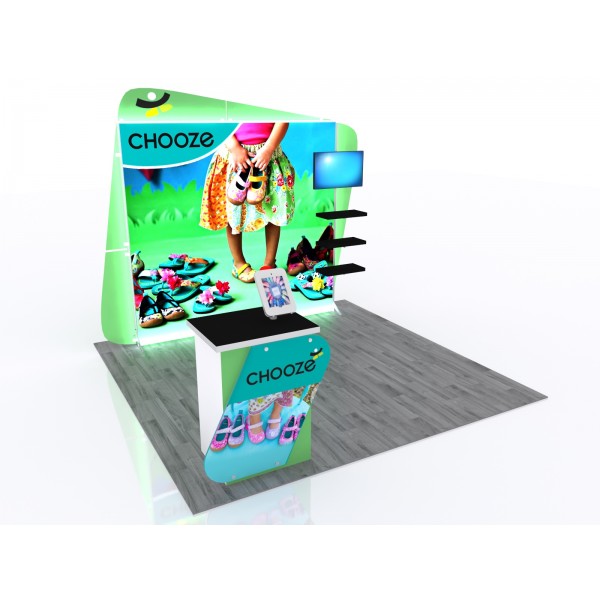 Segue Hybrid Backlit Display VK-1961 will make an impact at your next trade show! Backlit displays are the fastest growing trend in the trade show industry and this Segue display is top-of-the-line in backlit excellence. This complete kit design includes a monitor mount, floating shelves, and a locking counter with an iPad stand. Modular design, silicone edge graphics, and lightweight aluminum hardware combine to create a perfect option for a 10’ x 10’ trade show booth space. LED lighting and high-quality graphics will beautifully showcase your message.