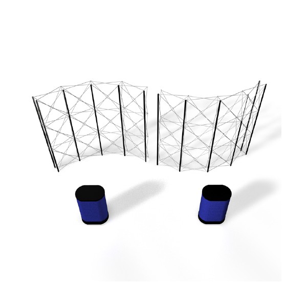 10' x 20' Serpentine Graphic Premium Pop Up Display is simply two 10' premium pop up frames used together to great a 20ft display. The concave side of the one frame is used and the convex side is used on the other frame. There is a 15"w center graphic connector panel that hooks on to each 10ft frame giving the display a 20ft seamless graphic mural backwall. The serpentine layout works great in a 10' x 20' trade show booth space and can also be used in the center of a 20' x 20' Island booth. This 20ft pop up display includes a self-locking aluminum frame, wheeled case, connected channel bars, lambda graphic mural panels, fabric endcaps, 4 halogen lights and case-to-counter conversion kit. Our premium pop up display line is identical to the Nomadic Instand Pop Up Display System.