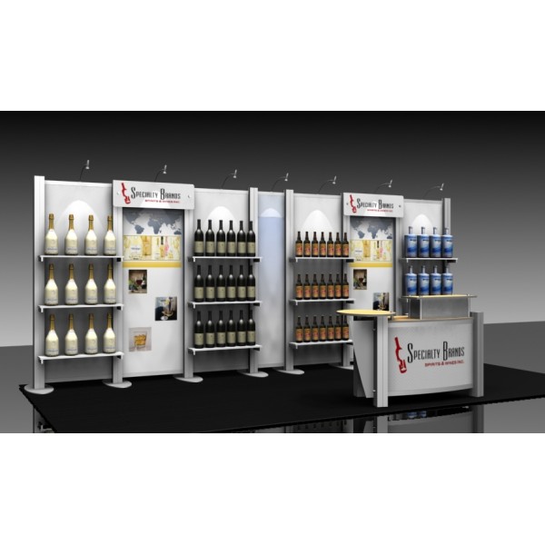 XRline 10 x 20 Custom Modular Display 1.3 is a portable aluminum modular 20' wide trade show booth that features 12 laminate shelves for displaying product. In addition to portable user-friendly frame hardware, our 1.3 display booth includes affordable SEG seamless stretch fabric mural graphic panels that fit in between each vertical aluminum frame column. This custom trade show booth design can be modified if needed on each customer order. Easily reconfigure this 20' wide inline display wall down to a smaller size that will fit any 10' x 10' booth space!