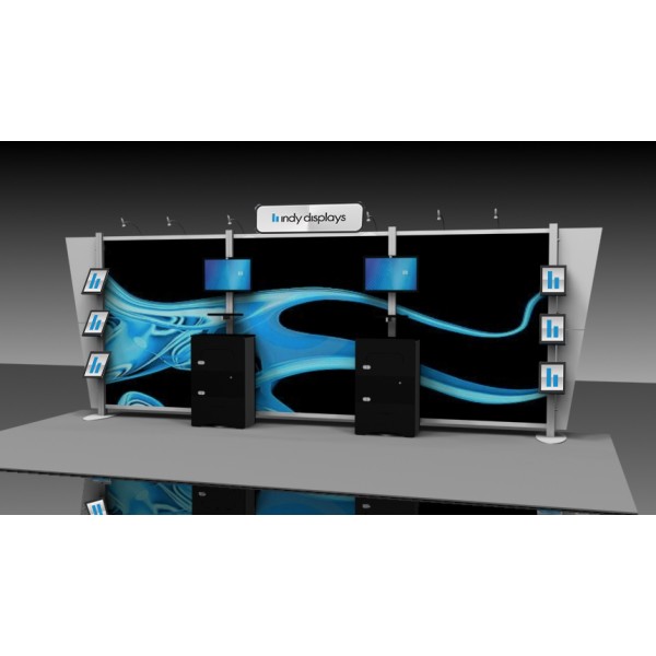 XRline 10x20 Custom Modular Display 1.5 is a portable 20ft trade show display backwall that features a combination of laminate locking counter and large format tension fabric graphics. This exhibit booth design includes two kiosks that attached to the backwall along with aluminum brochure holders. Easily reconfigure this 10x20 display into a 10x10 display. Turnaround time on this display is 7 to 10 business days after artwork approval. For more information contact us at 833-257-6278 or simply submit a Request A Quote email.