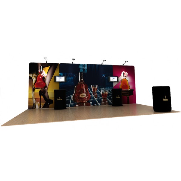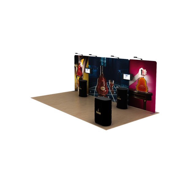 The Waveline 20' Media Display Kit A is a simple straight backwall package that includes multimedia features along with counters and trade show lighting. The hardware system includes durable aluminum tubing combined with wrinkle-resistant polyester graphics that create vibrant large format graphics. In addition to this displays portability, is can simply be reconfigured into a 10' Waveline Display or can be customized to fit a 20' x 20' island exhibit. Add one of our haning sign options to attract attention form afar.
