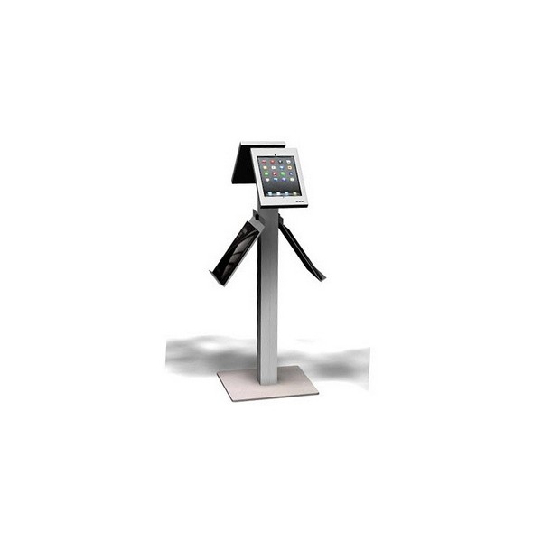The iPad.S2.3 Kiosk Stand is a cleaning looking iPad kiosk stand that allows you to interact with two iPads, while also having the benefit of two literature shelves. It has a modern design, is quick and easy to set up, and is light weighing in at 20 lbs. As a security feature, this product comes with a lockcase which is accessible using a key.