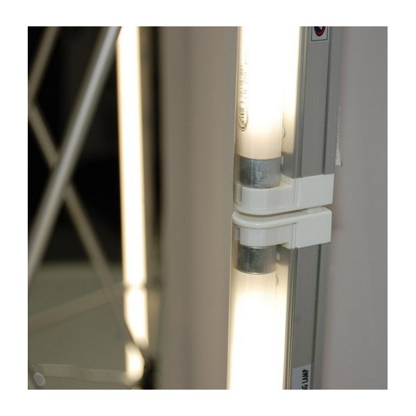 The Indy Displays Brand-Name Burst 8ft Flat Backlit Pop Up Display is an 8' x 8' best-selling backlit pop up display. The V-Burst portable system was the pioneer and original tension fabric pop up display, that features one seamless stretch fabric mural graphic. Inside the 8'w x 8'h flat frame are three 3-piece fluorescent hanging light bars, that provide ample graphic mural illumination. The backside of the frame includes a seamless white fabric that attaches to the frame using hook velcro.
