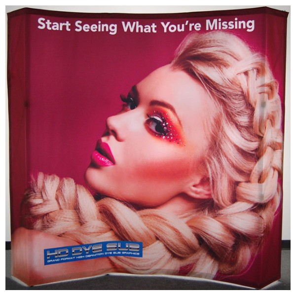 Indy Displays Brand-Name Burst Fabric Pop Up Display System has been an industry leader in quality and durability for many years. The Burst System was the original tension fabric pop up display that featured one seamless fabric mural graphic attached to a traditional pop up frame. The Burst 8ft Curved Backlit Pop Up Display features all of the components that the traditional burst display featured. However this display unit has been ehnanced with a custom backlighting system that dramatically increases the visual impact of your logo, images, and message.