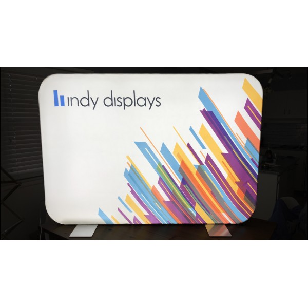 This Indy Displays exclusive LED Rounded Edge Backlit Tabletop Display System is one of our most unique innovative SEG frameless light box kits available on the market. Unlike our standard modular LED light box free-standing display walls that includes straight corner frames, our "next generation" aluminum portable frameless LED edge-lit powerful graphic light box system provides exhibitors with vibrant illuminated SEG fabric graphics seamlessly attached to the exhibition industry's first rounded corner frame. Indy Displays standard rounded corner backlit table top display size is 5'w x 3.5'h, the perfect expo table presentation display size for both 6' and 8' event folding tables. However, this versatile modular table display frame can be easily customized to a smaller table top light box or enlarged up to 8' wide for ample illuminated table top brand visibility!