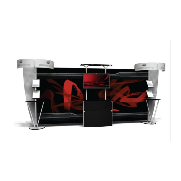 The structure of this 10x20 trade show display is made from durable and lightweight aluminum extrusions. The structure of the Exhibit Line system gives your company a clean, modern look. The ex3.1020.1 display kit includes four halogen light canopies, four lit racks and also includes 2 V-leg counters for product placement and center kiosk with a monitor mount and attached enclosed counter. The entire trade show booth can be packaged into three 48.25T shipping cases (47" x 23.5" x 7"). Total weight of the exhibit booth is 179 lbs.