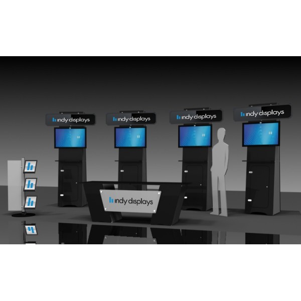 This unique Exhibit Line 20ft Kiosk Kit features four custom laminate kiosks that create a modern interactive 10x20 booth space. Ideal monitor size is 32" but larger monitors may be used. In addition, this display kit includes a custom Exhibit Line laminate desk with front stand off logo along with one Exhibit Line brochure holder. Each interactive kiosk also features locking storage for CPU's or other valueable items. For more information please submit a Request a Quote form or contact us at 833-257-6278.