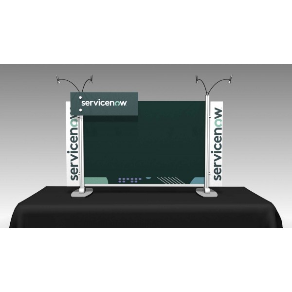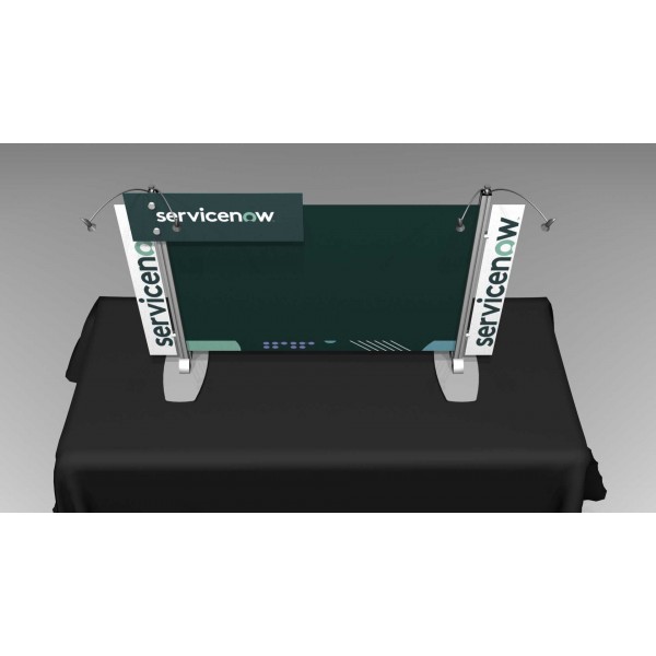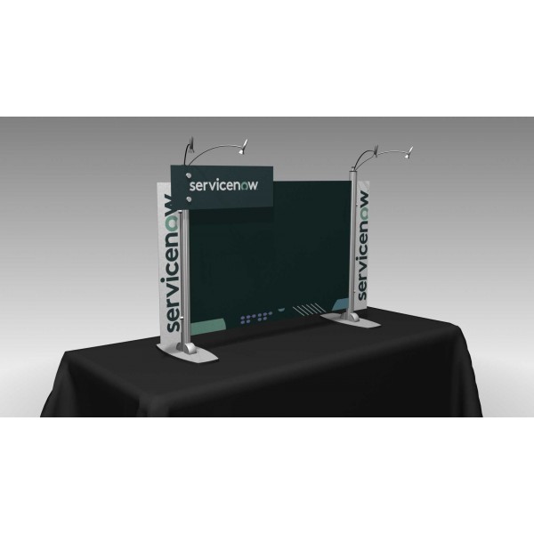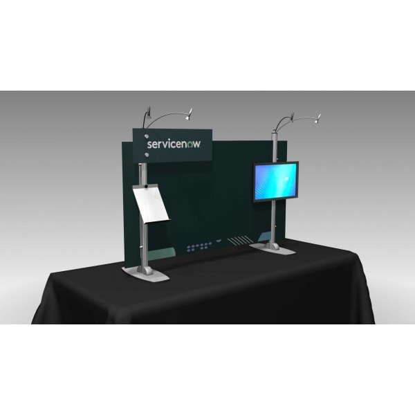 Exhibitline Modular EXC Table Stand is a customized aluminum modular portable tabletop trade show display. Featuring tool-less assembly, user-friendly SEG fabric graphic mural, stand-off profile logo header, slim accent wings with UV full color printing and 4 attaching halogen stem lights. Pack this entire table display inside it's mini flat pack wheeled hard case (included with kit). This versatile tabletop display can be setup by one person in 15 minutes.