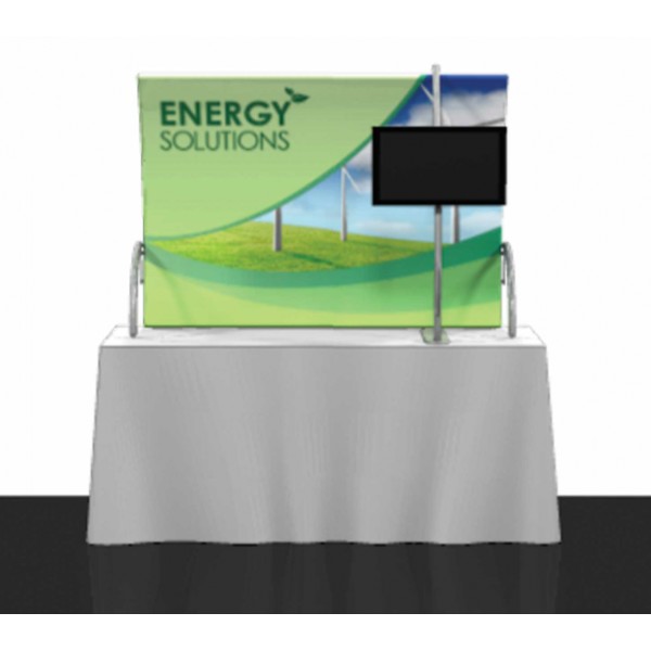 The Formulate Tension Fabric Table Top Display Kit 3 (monitor mount option) adds a whole new dimension to your trade show booth with a seamless fabric table top graphic. This display combines an easy to assemble aluminum tube frame with a pillow case dye sublimation graphic. Formulate Table top kit 3 includes a stand off aluminum bar with monitor mount that hold up to a 22" monitor.