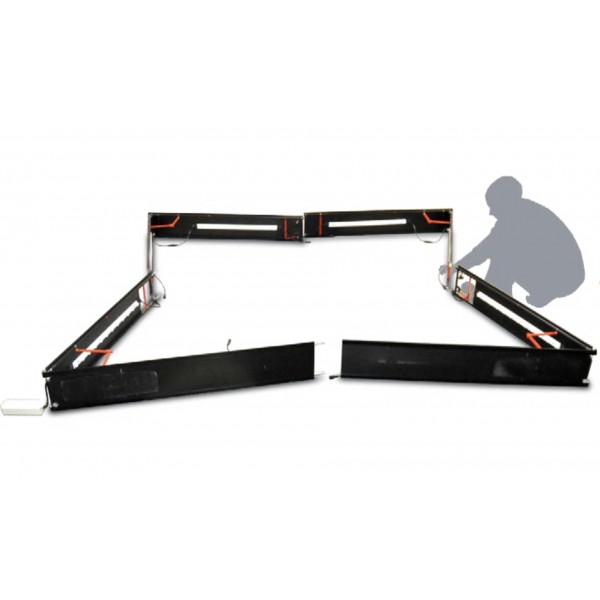 When setting up your Pliko LED backlit display, first remove each of the four folded modular frame sections from the rolling hard case. Once the sections havw been removed, simply unfold each 2-sided column and lock the frame sections in position by pushing in the red brace until it "snaps" into place.