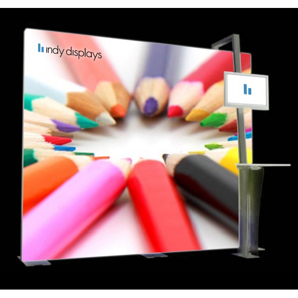 10' Hybrid Lightbox Monitor Kiosk Display Package combines our best-selling 8' x 10' aluminum modular LED backlit fabric display with seamless multimedia integration. Th hybrid display accessory enhancement includes a slim durable modular vertical front column with universal flat monitor mount and laminate kiosk shelf will hold a keyboard and computer mouse. The ultra-portable display wall frame includes built in LED stip lights that provide extreme graphic illumination, that's guaranteed to attract maximum attention for exhibit hall foot traffic.