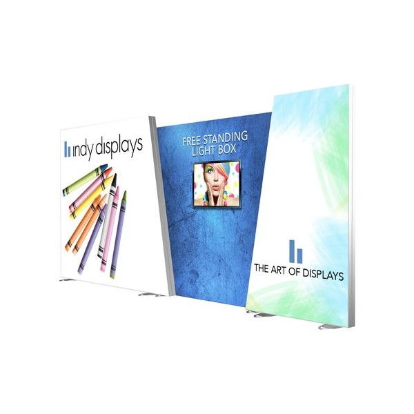 Angled 20 foot Frame LED Light Box Display Wall is an ultra-versatile portable 3-frame backlit display booth that features slanted vertical frame columns, seamless SEG fabric mural graphics, internal eco-friendly LED light strips and user-friendly flat pack wheeled expo cases. This 10' x 20' backlit modular display structure is uniquely designed using 3 free-standing modular light box displays. These 3 backlit booth stands may be used together to create a jaw dropping LED illuminated inline booth graphic wall, or may be reconfigured into a number of display booth design shapes (see additional images for reconfiguration ideas).