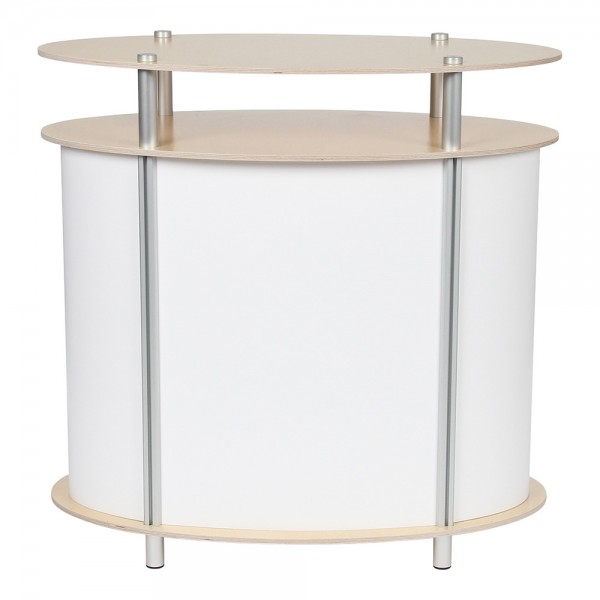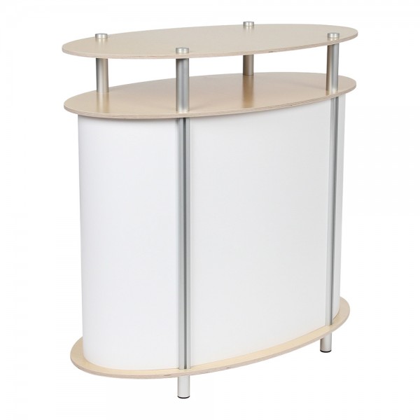 Our Ellipse Modular Counter offers premium quality and ultimate portability. Completely customizable, we have dozens of component combinations to fit your trade show needs. Set-up is quick and easy with the twist mechanism and only takes around 5 minutes! All panels can be printed with high quality, color images, or they can be purchased unprinted in black or white. Shelving is available in birch (as pictured), black laminate, white laminate, or plexi-glass, and the option to mix and match shelving is also available. The included, hard-shell cases provide important storage and shipping benefits. The Ellipse Modular Counter is an excellent addition to any booth space, including 10x10 and 10x20 booth spaces, retail environments, and showrooms. The double counter provides a top level countertop for customer interaction, yet also has space for literature and products to be accessible and in-view on the lower level countertop.