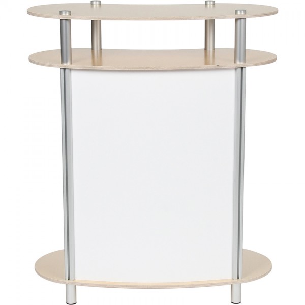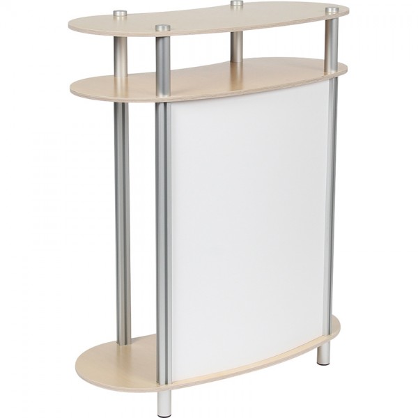 Our Kidney Modular Counter offers premium quality and ultimate portability. Completely customizable, we have dozens of component combinations to fit your trade show needs. Set-up is quick and easy with the twist mechanism and only takes around 5 minutes! All panels can be printed with high quality, color images, or they can be purchased unprinted in black or white. Shelving is available in birch (as pictured), black laminate, white laminate, or plexi-glass, and the option to mix and match shelving is also available. The included, hard-shell cases provide important storage and shipping benefits. The Kidney Modular Counter is an excellent addition to any booth space, including 10x10 and 10x20 booth spaces, retail environments, and showrooms. The double counter provides a top level countertop for customer interaction, yet also has space for literature and products to be accessible and in-view on the lower level countertop.